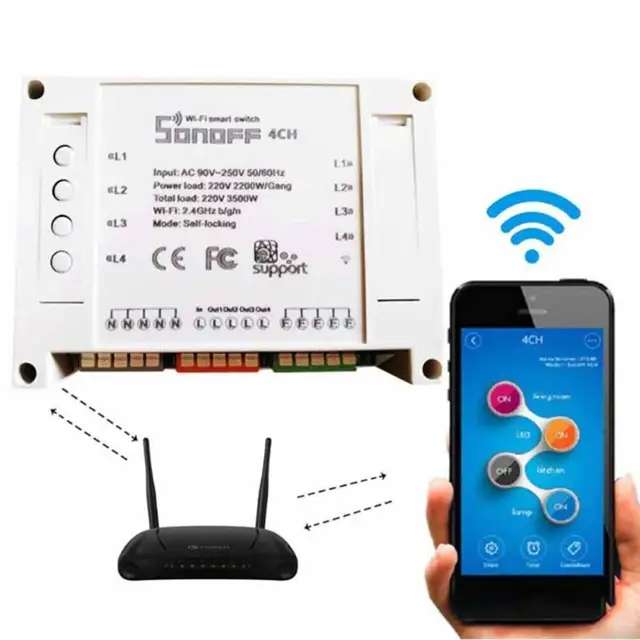 Sonoff 4CH supports to connect and control 4 home appliances, which can be turned on/off separately by the buttons or iOS and Android APP EweLink. Owning a Sonoff 4CH means you have 4 Sonoff basic WiFi switches integrate together.