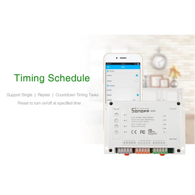 Support to connect and control 4 home appliances, which can be turned on/off separately by the buttons or iOS and Android APP eWelink.