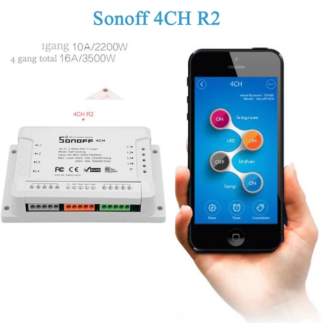 Sonoff 4CH R2 supports to connect and control 4 home appliances, which can be turned on/off separately by the buttons or iOS and Android APP EweLink. Owning a Sonoff 4CH means you have 4 Sonoff basic WiFi switches integrate together.