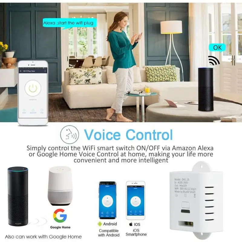 Multi-purpose Design: Compatible with Android/iOS smartphones and tablets. Support 2.4G WiFi and AC 85-265V voltage. Ideal for controlling the most household appliances, such as, electric fan, lamp, electric cooker, air conditioner, water heater, electric pot, TV, humidifier and other appliances with pre-set ON/Off function.