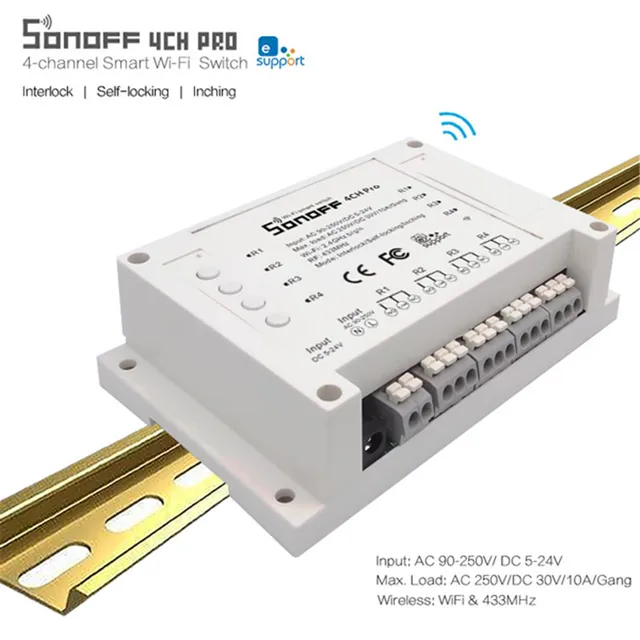 Sonoff 4CH Pro is a 4 gang WiFi switch. It supports switch among 3 working modes: interlock/self-locking/inching(0.25-4s adjustable) mode. It integrates with a 433MHz RF receiver module, making the switch can be controlled by RF Remote. The Sonoff 4CH Pro smart switch is DIN