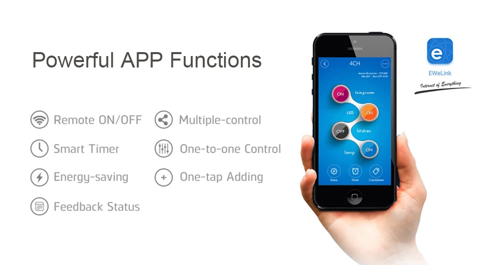 4.In "EweLink", you can remote turn on/off from anywhere at any time, set single/repeat/countdown timing schedules to turn on/off at a specified time, share to others so that they can control together.