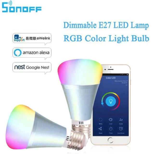 Sonoff B1 is white and color ambiance dimmable LED bulb with E27 screw base. The dimming led lamp can be dimmed or brighten via iOS/Android App. With the App, users can select White, then the light will become white ambiance, they can set color temperature from cold to warm and change the brightness from 1%-100%. If they select color, they can change color spectrum of the RGB bulbs to favourite atmosphere. There are four available scenes for the dimming LED bulb: rest, reading, party and casual. The Sonoff B1 E27 color LED bulb is compatible with Amazon Alexa(Amazon Echo, Echo Dot, Tap). Users can ask Alexa to dim or brighten, or adjust the colors of the led light bulb.