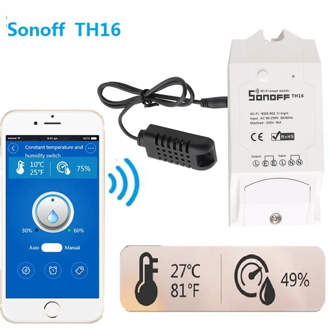 Sonoff TH10/TH16 is a Sonoff version smart switch that can monitor and set temperature and humidity through the APP eWeLink. Just as the name indicated, the new version Sonoff TH device supports two power supply specifications: 10A or 16A. It supports preset a temperature and humidity range, when the temperature and humidity of the environment fall into the range, it will automatically turn on or turn off connected devices.