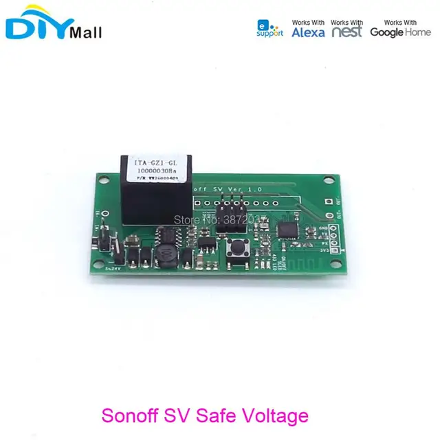 Sonoff SV(safe voltage) is a low power supply Sonoff version,which supports 5-24V power supply. The power separation circuit enables it to control AC or DC power for the connected device, but you need to do some welding to realize this function. Sonoff SV has GIPO reserved to support secondary development. This version does not have 433 RF function and without shell.